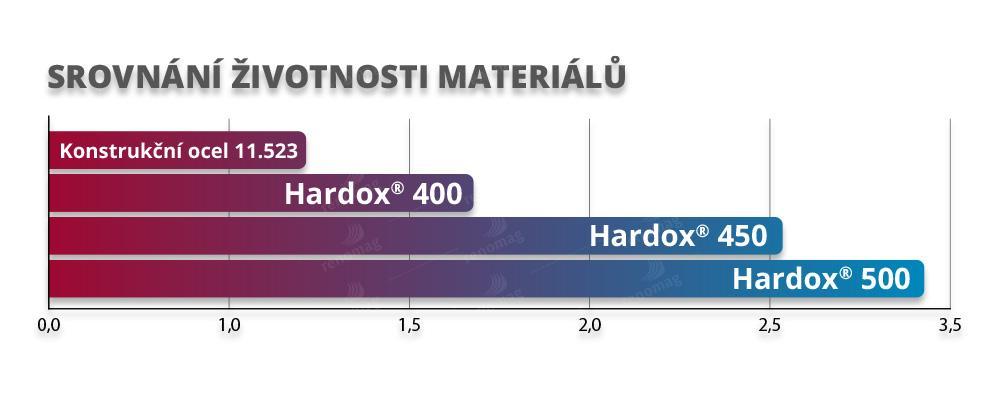 Lehká konstrukce z velmi odolného materiálu Hardox 500 Tuf švédského výrobce SSAB.