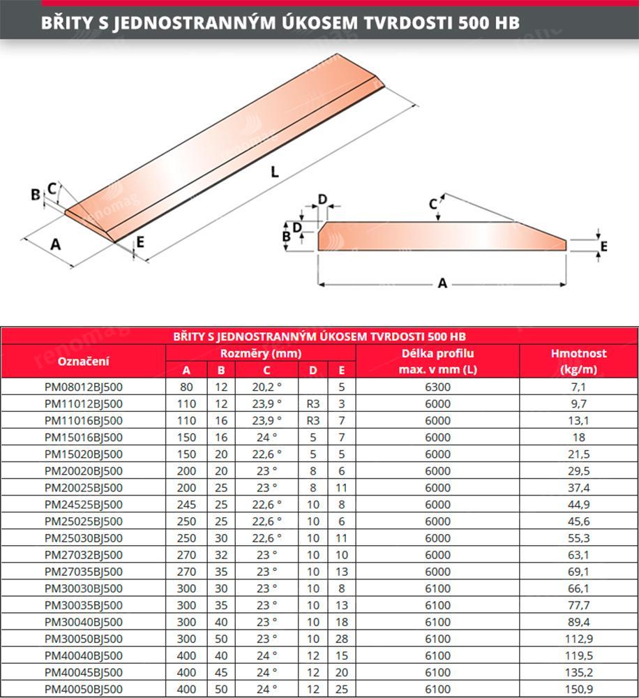 Pro opravu a výrobu lžic a lopat nabízíme válcovaný kalený profil, nadělený na délku dle přání zákazníka s úkosem tvrdosti 230 HB, 400 HB, 500 HB v různých tloušťkách.